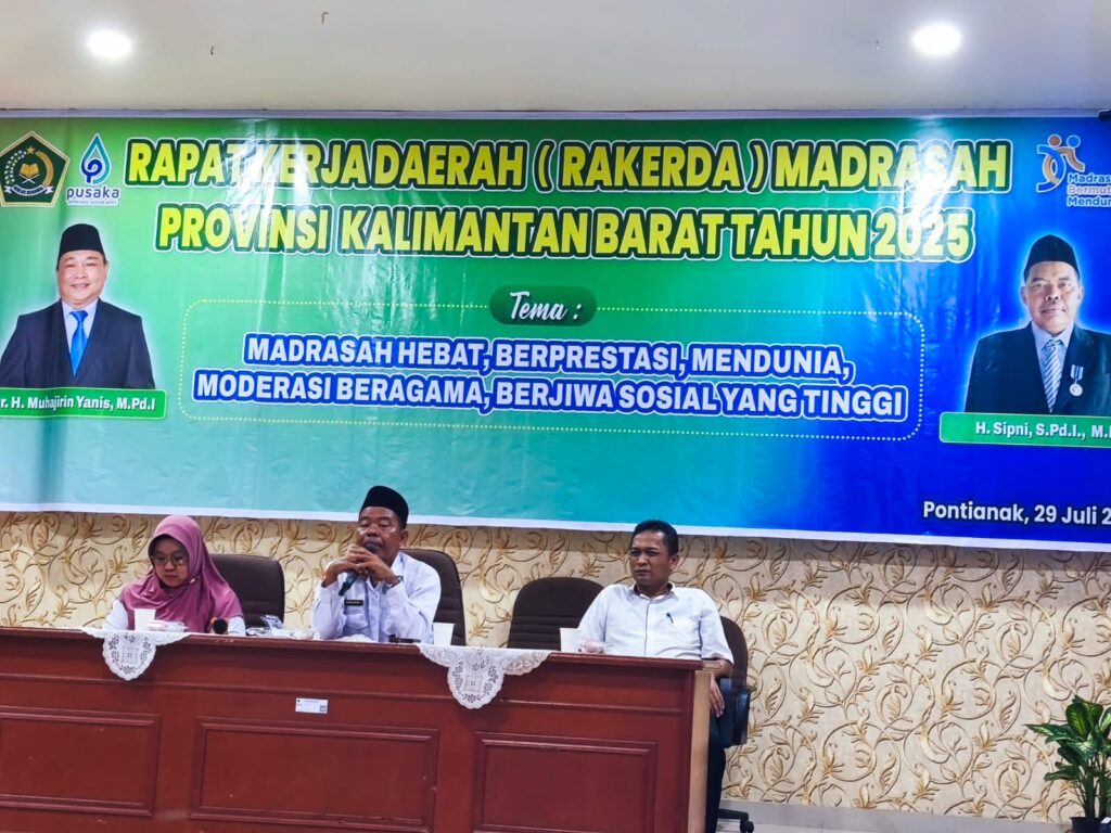 Kegiatan Rapat Kerja Daerah (RAKERDA) Madrasah Provinsi Kalimantan Barat tahun 2025 diselenggarakan di Aula Kantor Wilayah Kementerian Agama Provinsi Kalimantan Barat. Kegiatan ini dibuka secara resmi oleh Plt. Kepala Kantor Wilayah Kementerian Agama Provinsi Kalimantan Barat yang sekaligus menjabat sebagai Kepala Bidang Pendidikan Madrasah (Penmad).
